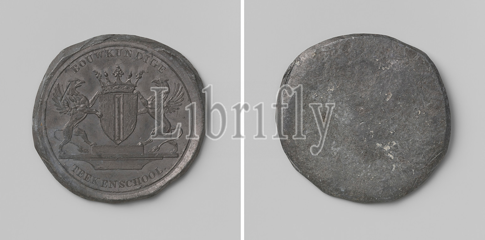 Architectural Drawing School, Delft, Unilateral Lead Medal, Obverse, crowned coat, arms, worn, two griffins within, inscription, Reverse, blank, Netherlands, 1750, 1850, striking, metalworking