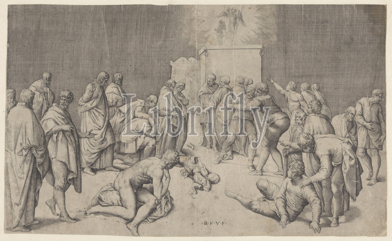 Ark, Covenant, Temple, Dagon, Philistines place, Pieces, broken statue lie, ground, statue, Ashdod falls down, Battista Franco, mentioned, object, Italy, 1520, 1561, paper, etching