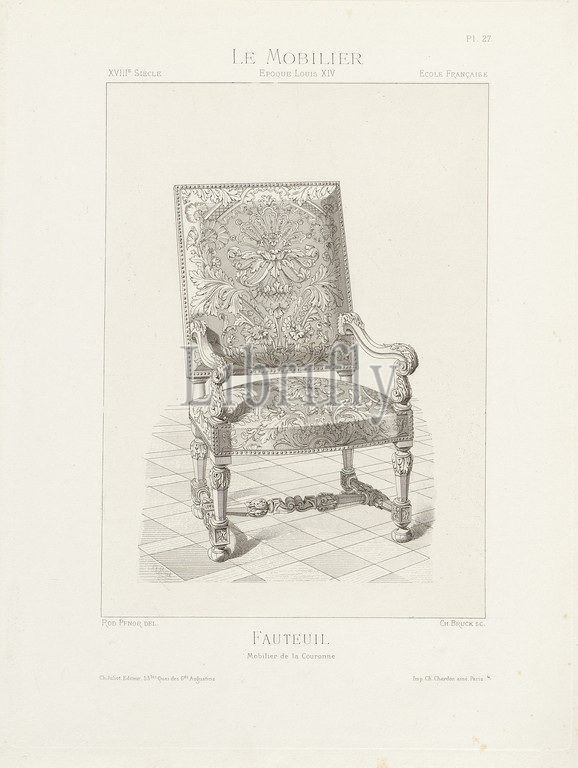 Armchair, Crown Furnishings, 18th century armchair, Louis XIV style, Signed, Rod., Pfnor del, Ch. Juliot, Editeur, Ch. Bruck sc, Imp. Ch. Chardon ainé, Pl. 27, p. 8, Pfnor, Rodolphe, del., Brück, Ch., sc., Juliot, ed., Chardon, Ch. ainé, imp., Rodolphe Pfnor, Le mobilier de la couronne, des grandes collections publiques, particulières du XIIIe siècle, XIXe siècle, mobilier civil, Mobilier religieux, Meubles, tentures, tapisseries, bronzes, objets d'art de toutes les époques accompagnés de dessins, grandeur d'exécution, Paris, Ch, Juliot, Editeur, Librairie Générale de L'Architecture, des Travaux Publics, 1874-1876