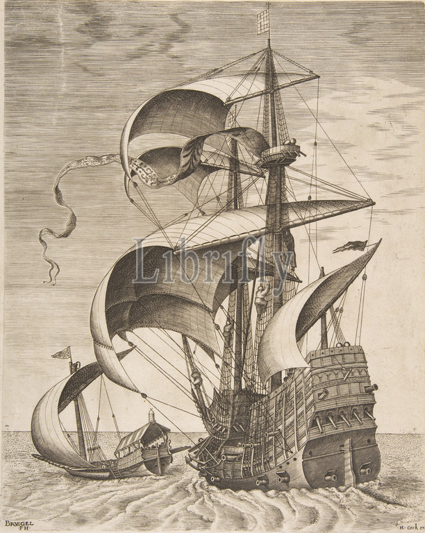 Armed Three-Master on the Open Sea Accompanied by a Galley from The Sailing Vessels, 1561–65, Engraving and etching; second state of three, sheet: 13 1/4 x 10 1/4 in. (33.6 x 26 cm), Prints, After Pieter Bruegel the Elder (Netherlandish, Breda (?) ca. 1525–1569 Brussels), Frans Huys (Netherlandish, 1522–1562)
