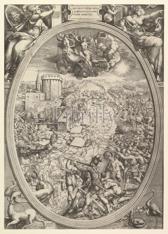 Army, Charles V Crossing, Elbe River, 1551, Engraving, sheet, 20 3/4 x 14 3/4, 52.7 37.5 cm, Prints, Enea Vico, Italian, Parma, 1523–1567, Ferrara, After, Giovanni Battista Scultori, 1503–1575, and/or after Franco, Venice ca., 1510–1561, Venice