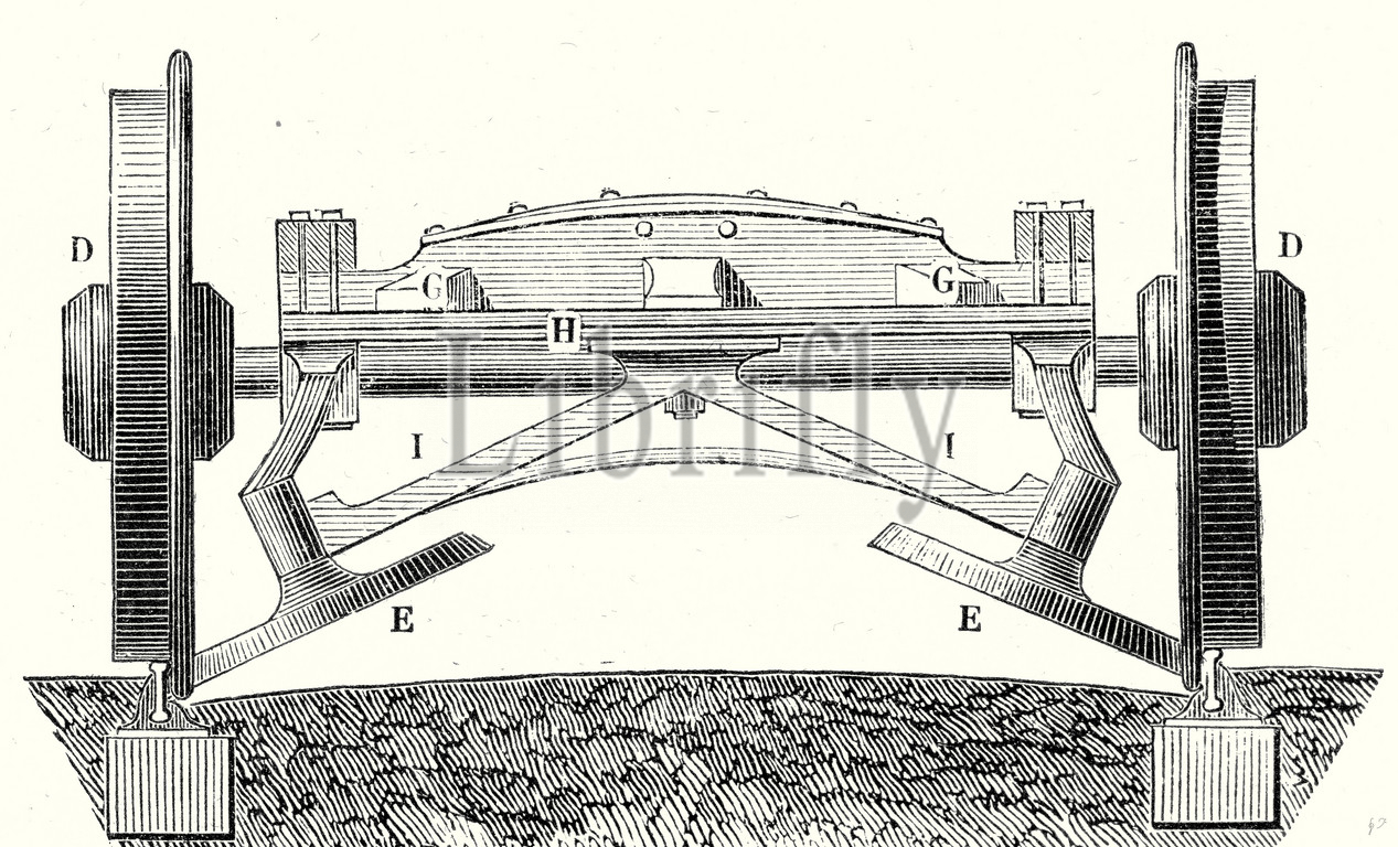 chassis, flat wagon, flatcar, flat car, flat deck, arux's system, arux, techlogy, mechanical, 19th century, train, transport, travel, track, transportation, rail, railroad, traffic, railway, railroad, 19th century engraving, old print, age of steam, 19th century history, nineteenth century, wheels, oblique wheels, slanted wheels, vintage, old print, 19th century, victorian, retro, quint, lox, engraving