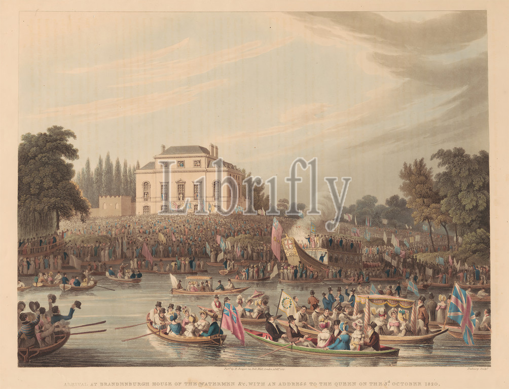 Arrival, Brandenburgh House, Watermen, Print, Matthew Dubourg, active 1786–1838, British, Published, Robert Bowyer, 1758–1834, British, 1821, Etching, aquatint, hand coloring, watercolor, medium, slightly textured, cream wove paper