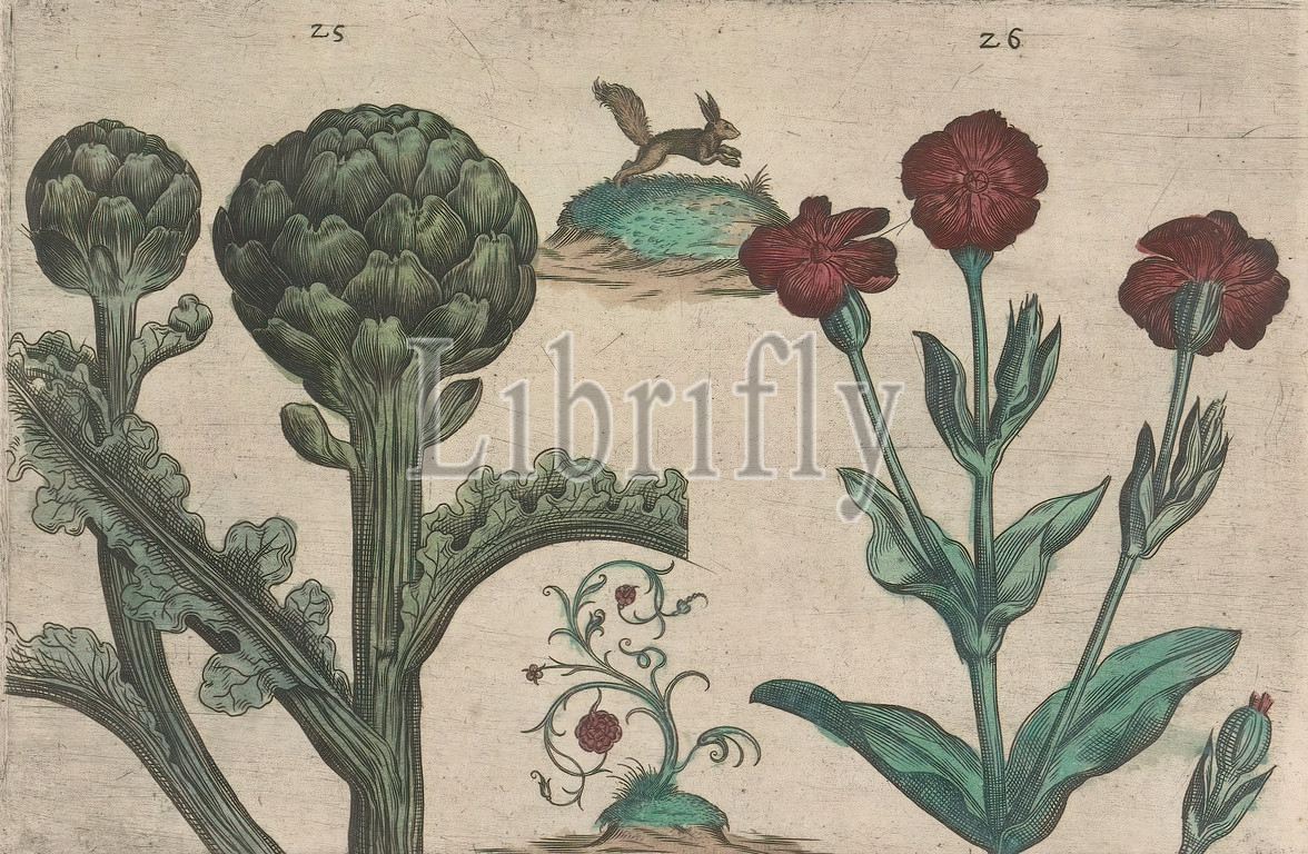 Artichoke (Cynara cardunculus) and needle nose (Silene coronaria), Artichoke and needle nose. With a jumping squirrel and an ornamental plant. FIGs. 25 and 26 on a sheet hand numbered 14. In: Anselmi Boetii de Boot I.C. Brugensis & Rodolphi II. Imp. Novel. medici a cubiculis Florum, Herbarum, ac fructuum selectiorum icones, & vires pleraeque hactenus ignotæ. Part of the album with sheets and plates from De Boodts herbarium from 1640. The twelfth of twelve albums with watercolors of animals, birds and plants known around 1600, commissioned by Emperor Rudolf II, anonymous, 1604 - 1632 and/or 1640, paper, ink, watercolor (paint), engraving, h 135 mm × w 205 mm h 160 mm × w 230 mm