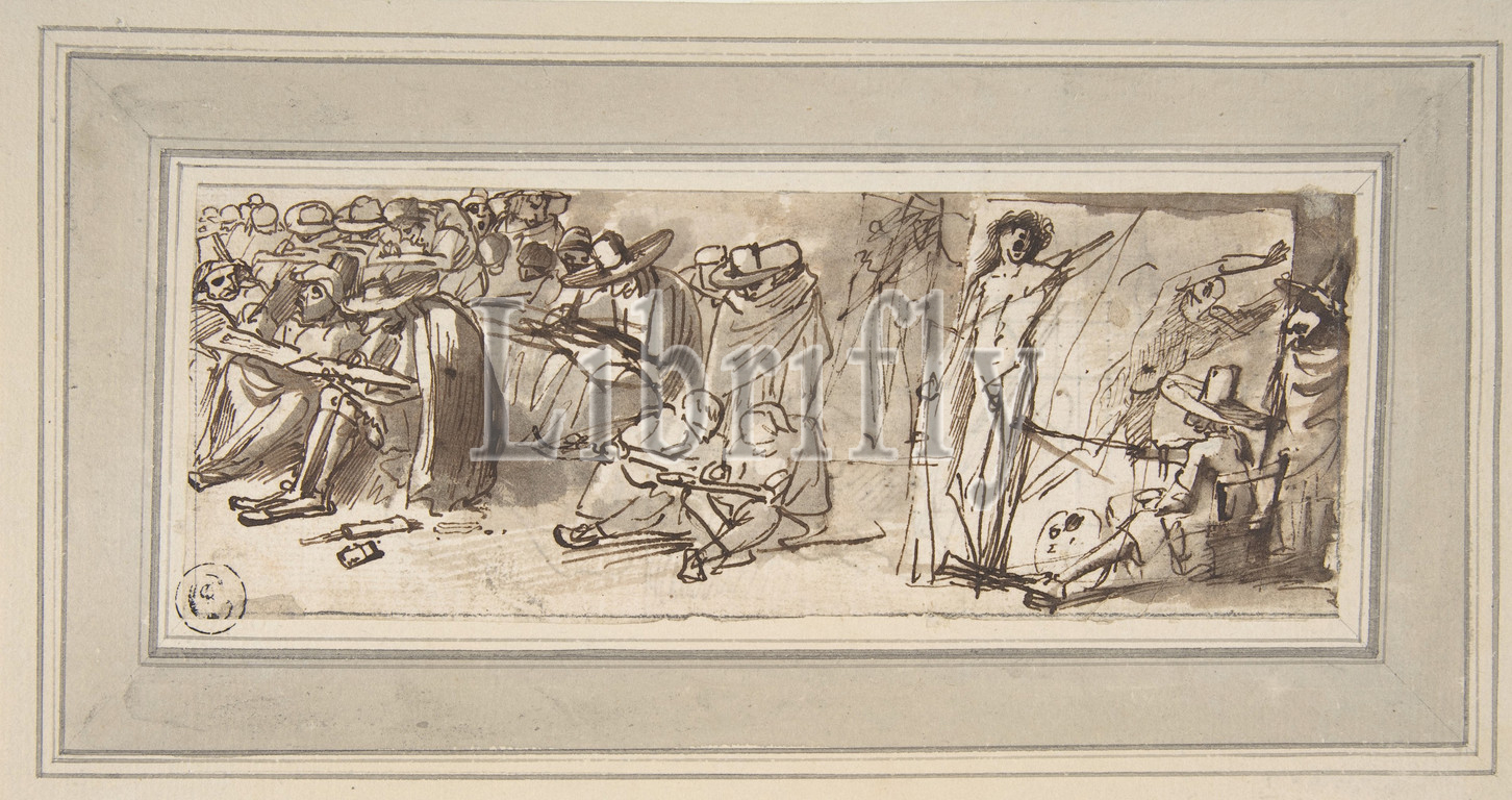Artists Drawing, Painting, Studio, 1612–66, Pen, brown ink, brush, wash, 2-7/8 x 7-7/8, 7.3 20 cm, Drawings, Pier Francesco Mola, Italian, Coldrerio, 1612–1666, Rome
