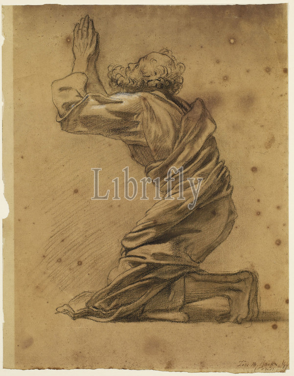 Ascension, Study, Kneeling Apostle, 1844, Verso, Back, Head, Child, 1844, Ford Madox Brown, Recto, bearded man, full length, kneeling, hands raised, prayer, Verso, Head, child, turned slightly, right, Art Movement, Pre-Raphaelite, Drawing, Pencil, Chalk, Religion, Sketch, Bearded, Full-length, Study