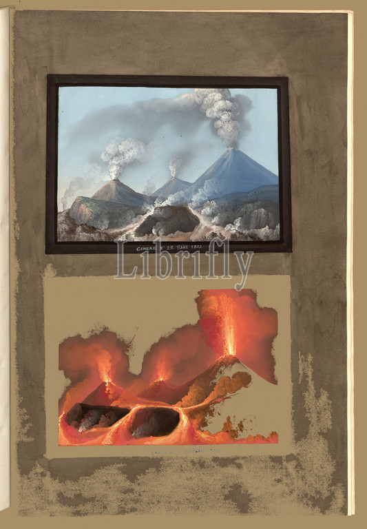 Ash 22, 8 October 1822 - Eruption of 22 8 October 1822, Vesuvius around 1822 with large eruption (below), copperplate engraving, hand colored, to p. 29, Fabris, Pietro, 1776, William Hamilton: Campi Phlegraei. Observations on the Volcanos of the two Sicilies. As they have been communicated to the Royal Society of London = Observations sur les volcans des deux Siciles (...). Naples: [s.n.], 1776