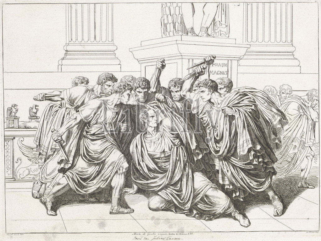 Assassination, Julius Caesar, Bartolomeo Pinelli, 1818, assassination, Julius Caesar, Brutus, senators, background, statue, Pompey, print maker, Bartolomeo Pinelli, mentioned, object, Bartolomeo Pinelli, mentioned, object, Rome, 1818, paper, etching, h 316 mm × w 42 mm