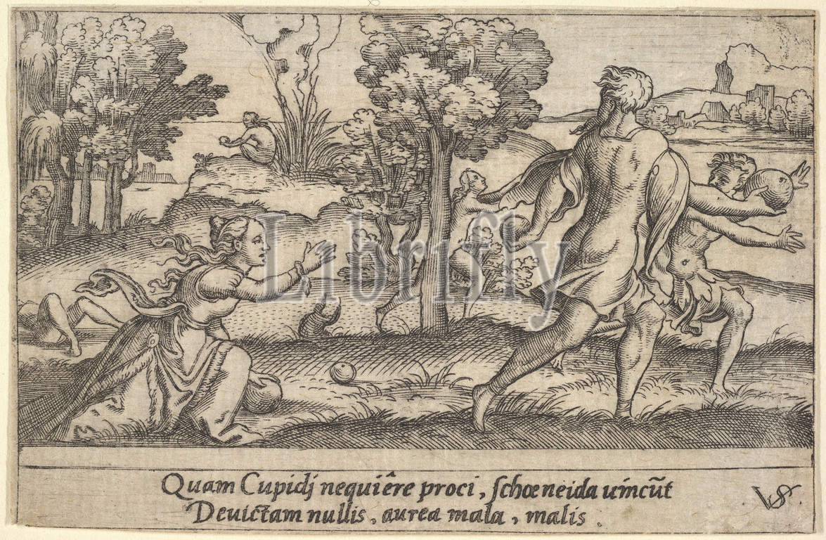Atalanta, Hippomemes, foreground Atalanta kneeling, pick up, apple, Hippomemes running, hand, landscape background, series, four mythological scenes, ca, 1535–62, Engraving, sheet, 2 5/16 x 3 9/16, 5.9 9.1 cm, Prints, Virgil Solis, German, 1514–1562, Nuremberg