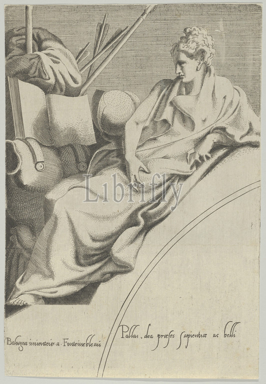 Athena, ca, 1540–45, Engraving, Sheet, trimmed, 8 15/16, 6 1/8, 22.7, 15.6 cm, Prints, Anonymous, Italian, 16th century, active Central Italy, ca., 1550–1580, After Léon Davent, French, active, 1540–56, Francesco Primaticcio, Bologna, 1504/5–1570, Paris