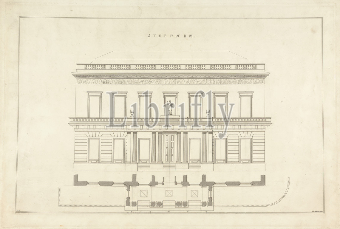 Athenaeum, Print, R, F, Cahusac, active 1830, British, Decimus Burton, 1800–1881, British, 1830, Etching, line engraving, moderately thick, slightly textured, cream wove paper, Sheet, Plate, Image, architectural subject, architecture, balconies, building, club, association, clubhouse, columns, architectural elements, frieze, entablature component, god, man, pillars, plan, drawing, railings, ruler, guiding tool, scale, rule, site plan, statue, technical illustration, urns, Athenaeum Club, City, Westminster, England, Greater London, London, United Kingdom