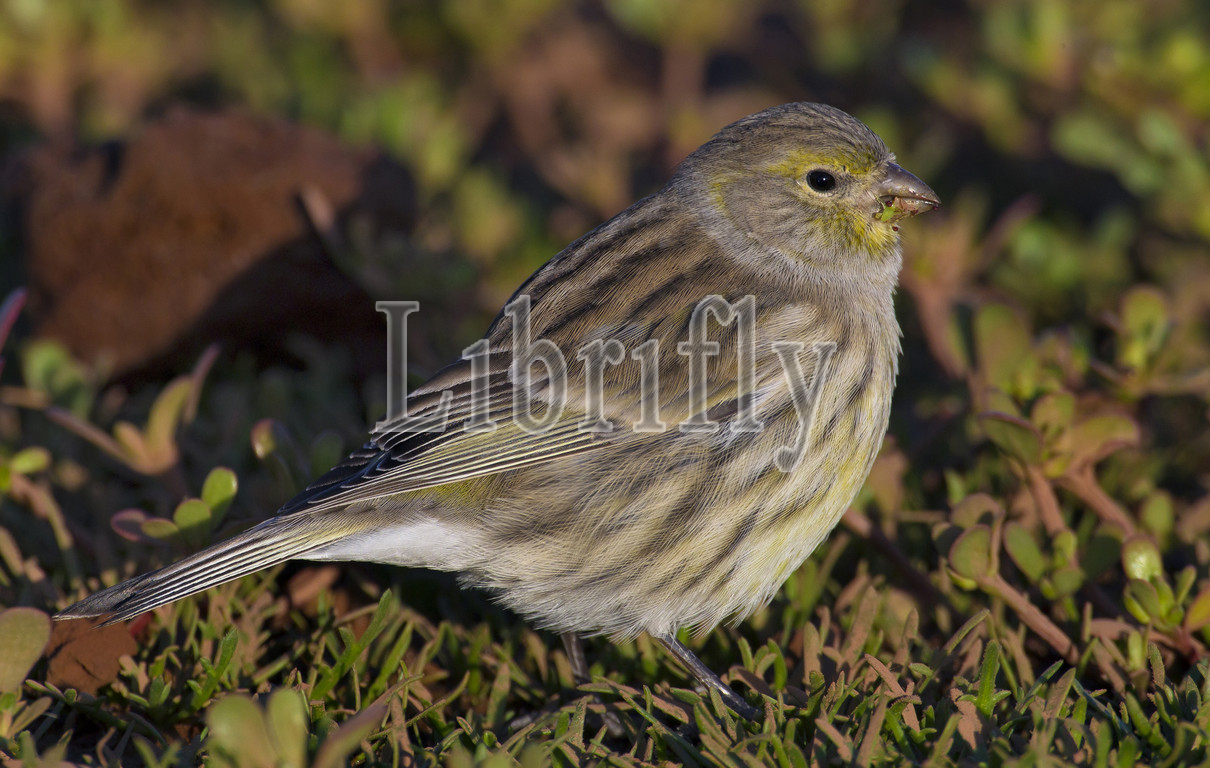 Atlantic Canary perched on the ground, Serinus canaria, Azores, Portugal