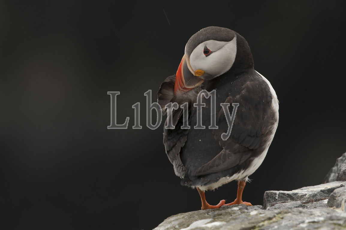 Atlantic Puffin adult washing on rock, Fratercula arctica, England