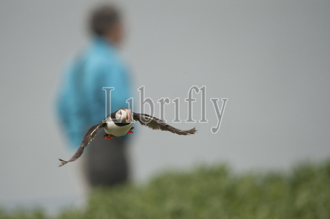 Atlantic Puffin flying with man in the back, Fratercula arctica, England