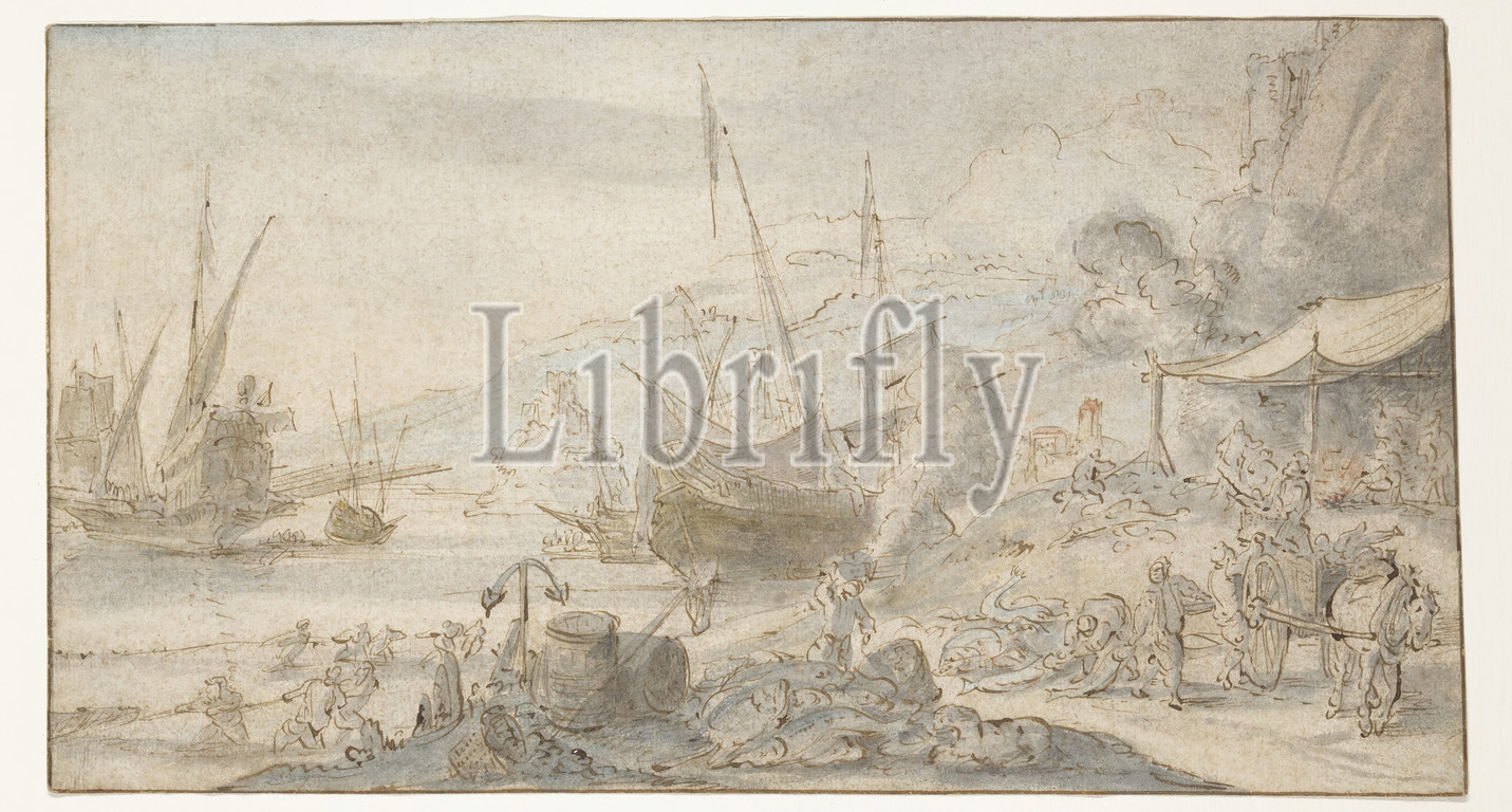 attributed, Bonaventure Peeters, Flemish, 1614-1652, Fisherman Hauling, Fish, 17th century, pen, brown ink, watercolor, black chalk, blue, ocher, red wash, buff laid paper, Sheet, 6 3/8