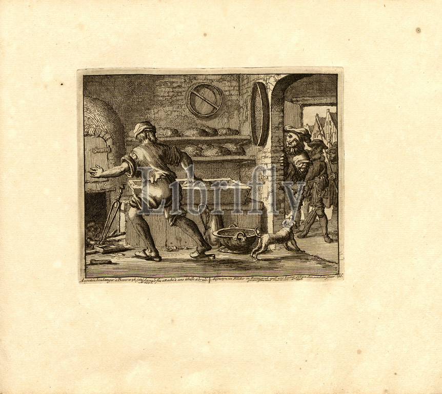 Augustin, baker, Beverwyk, thrown, fire attached, ladder, burned, Anno 1556, Parallel title, Augustyn, baker, Beverwyk auff, ladder tied, thrown, fire, burned, nn o 1556, copper engraving, 66., p. 141, Luyken, Jan, inv. et fec., Jan Luyken, Théâtre des martyrs, depuis la mort de J.Christ jusqu'à present, repréé en très belles tailles-douces = Schau-Bühne der Marty, gezeichnet, Kuppfer gestochen, Leyde, chez Pierre Van der Aa, 1711