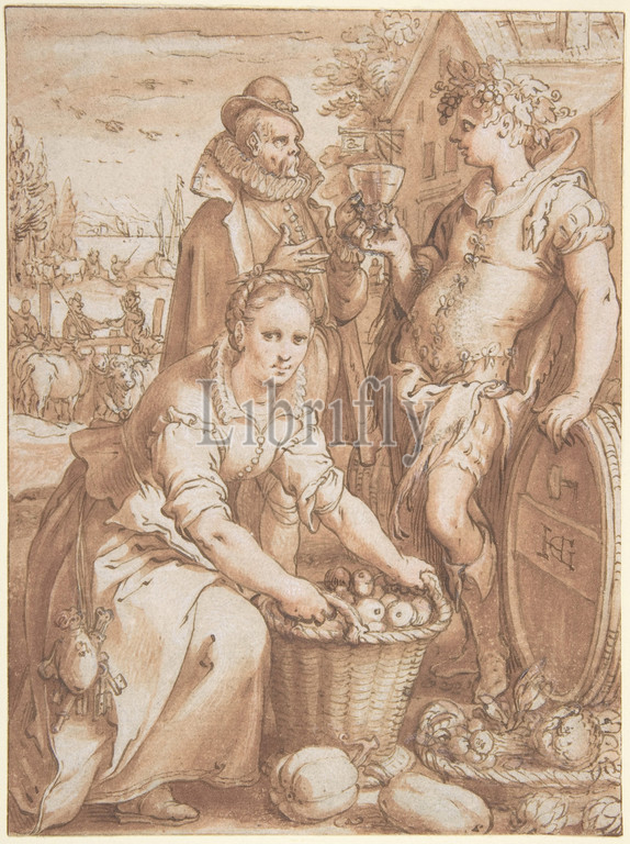 Autumn; Study for an Engraving, n.d., Pen and brown ink, red-brown wash, over black chalk, heightened with a little white gouache, 7 5/8 x 5 11/16 in. (19.4 x 14.4 cm), Drawings, Hendrick Goltzius (Netherlandish, Mühlbracht 1558–1617 Haarlem), This is the preliminary drawing for the third print in the series of seasons which Goltzius published around 1594. The strong pen and ink outlines and the tonal values indicated with wash were meant to guide the engraver, who was expected to translate the washes into patterns of burin lines