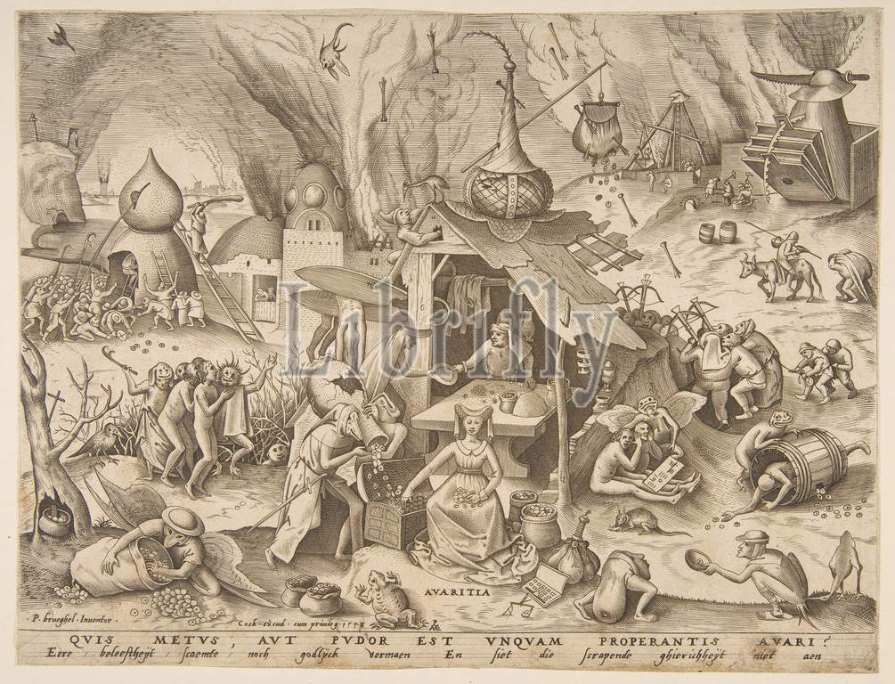 Avarice, Avaritia, series, Seven Deadly Sins, 1558, Engraving, first state, two, sheet, 8 7/8 x 11 11/16, 22.5 29.7 cm, Prints, Pieter Bruegel the Elder, Netherlandish, Breda, ca., 1525–1569, Brussels, van der Heyden