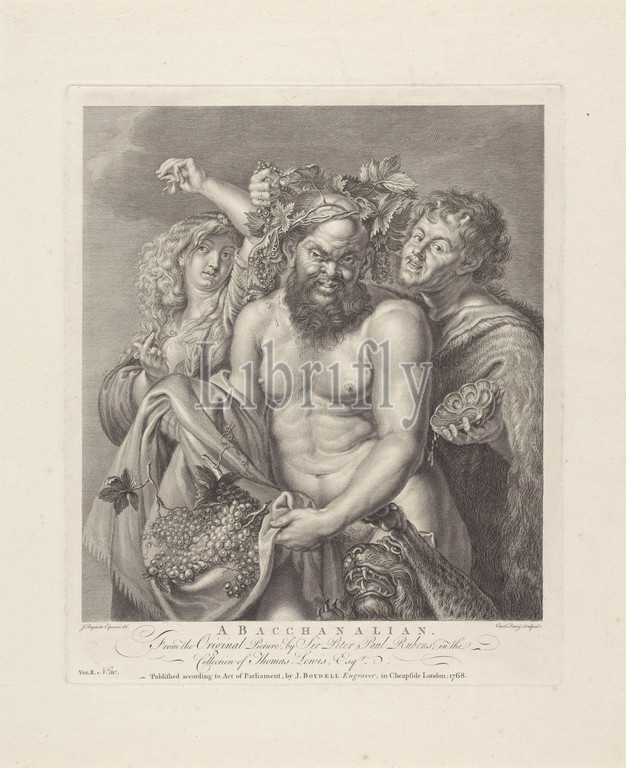 Bacchanal, Bacchanalian, title, object, Bacchus wine god, Bacchante, satyr, panther, Numbered lower left, Vo, II, No, 30, maenad, s, female bacchant, es, story, Bacchus, Dionysus, Liber, nymphs, general, Ninfe, commune, Ripa, Carlo Faucci, mentioned, 1768, paper, engraving
