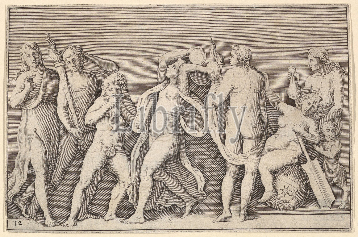 Bacchanale, Eight Figures, published ca, 1599–1622, Engraving, Third state, plate, 3 7/16 x 4 7/8, 8.8 12.4 cm, Prints, Engraved by Anonymous, Italian, 16th century, After Battista Franco, Venice ca., 1510–1561, Venice