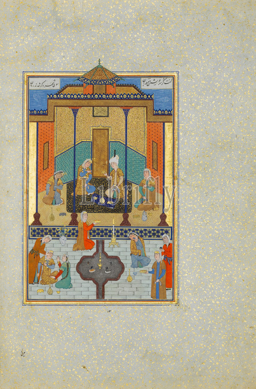 Bahram Gur, Sandal Palace, Thursday, Folio 230, Khamsa, Quintet, Nizami, .H, 931/.D, 1524–25, present-day Afghanistan, Herat, Ink, opaque watercolor, silver, gold, paper, Painting, H, 7 13/16, 19.8 cm, Codices, Painting by Shaikh Zada, Haft, Paikar, Seven Portraits, five poems, poetry, mystical, illustrating, supremacy, divine love, earthly pleasures, story, marries, seven, princesses, seven regions, world, visits, own pavilion, successive nights