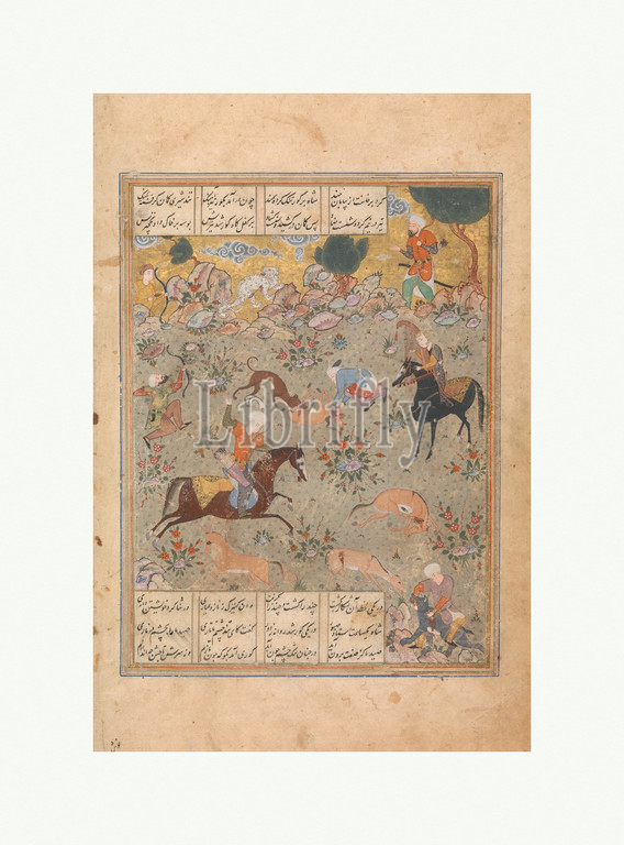 Bahram Gur, Skill Hunting, Fitna Watches, Folio, Haft Paykar, Seven Portraits, Nizami, mid-16th century, Attributed, Iran, Opaque watercolor, gold, ink, paper, Image 6 3/8, x 8 7/8, Codices, Excellence, pursuits, hunting, archery, essential, prince, education, stronger ruler, formidable warrior, Sasanian king Bahram, V, tries, impress, slave girl, Fitna, hunt