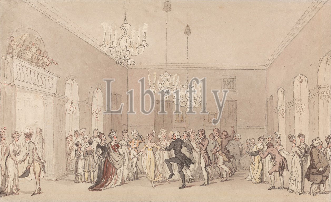 Ball, Scarborough, Thomas Rowlandson, 1756–1827, British, ca, 1820, Watercolor, pen, red ink, brown ink, black ink, gray ink, graphite, moderately thick, slightly textured, blued white, wove paper, Sheet, balcony, ball, party, chandeliers, dance, formal dresses, genre subject, men, musicians, room, windows, women, England, Europe, North Yorkshire, Scarborough, United Kingdom, Yorkshire