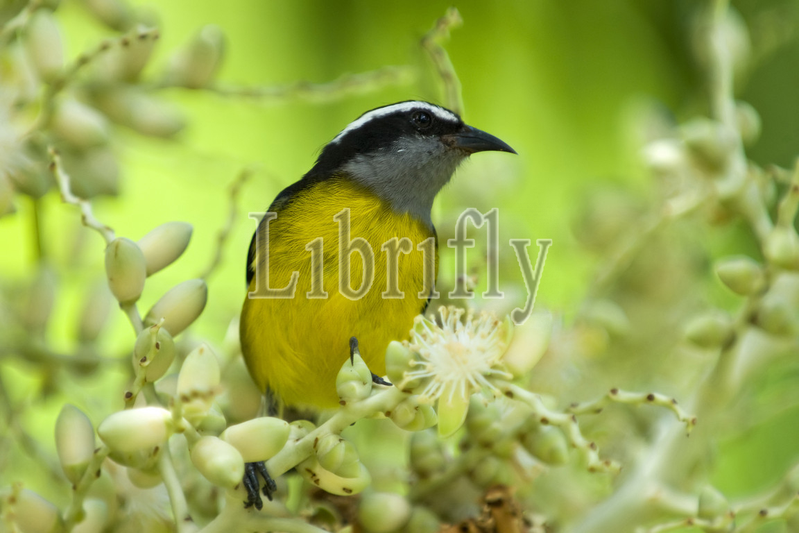Bananaquit in flowering Date Palm Tobago, Coereba flaveola
