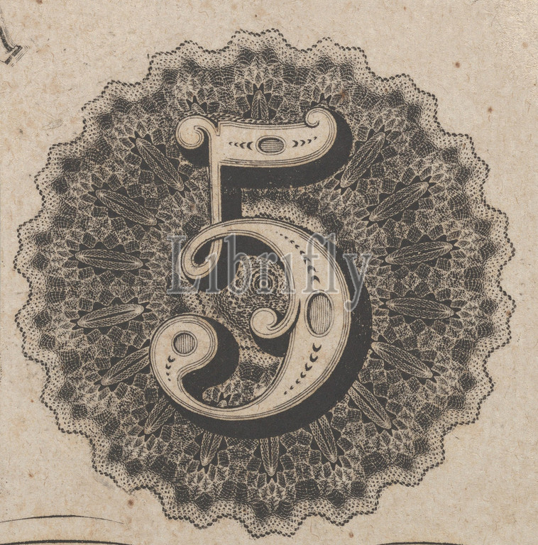 Banknote motif: number 5 against a circular panel of lace-like lathe work with a scalloped edge, ca. 1824–42, Engraving, sheet: 1 9/16 x 1 9/16 in. (4 x 3.9 cm), Prints, Associated with Cyrus Durand (American, 1787–1868)