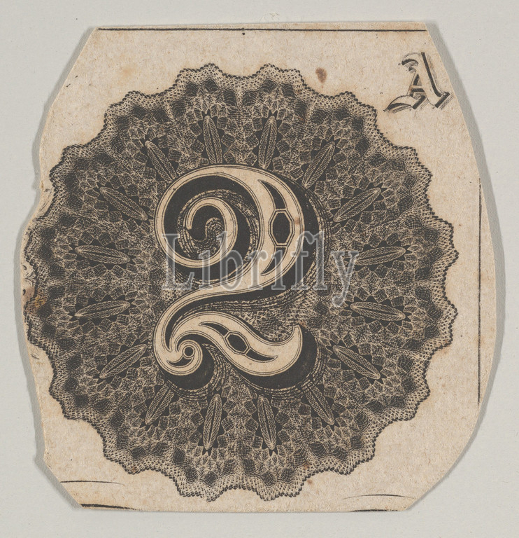 Banknote motif: number 2 against a circular panel of lathe work with a scalloped edge, ca. 1824–42, Engraving, sheet: 1 5/8 x 1 5/8 in. (4.2 x 4.2 cm), Prints, Associated with Cyrus Durand (American, 1787–1868)