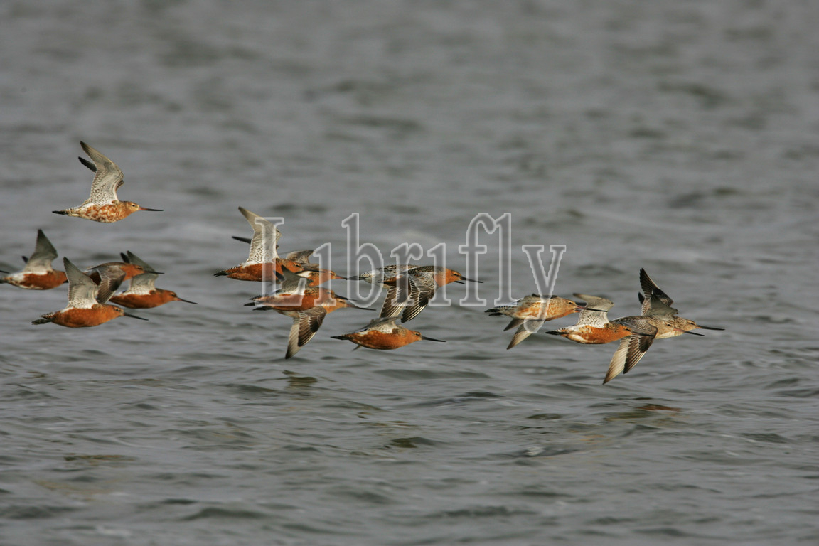 Bar-tailed Godwit flock flying, Limosa lapponica