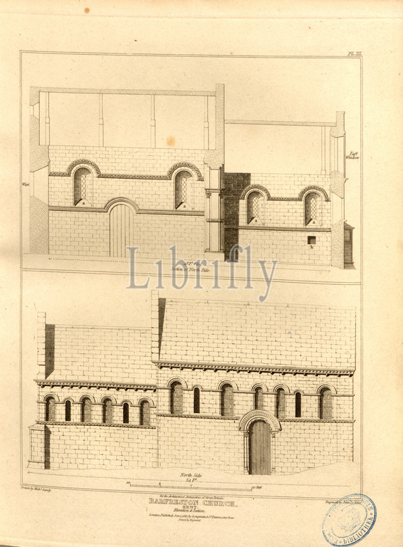 Barfreston Church, Kent, Elevation, St. Nicholas' Church in Barfrestone Kent, signed: Drawn by Mich., Gandy, Engraved by John Le Keux; Published by Longman & Co, Fig. 12, Pl. III, p. 52, Gandy, Michael (drawing); Keux, John Le (engraving); Longman & Co. (published), 1813, John Britton: The architectural antiquities of Great Britain: represented and illustrated in a series of views, elevations, plans, sections and details of various ancient English edifices: with historical and descriptive accounts of each. Bd. 4. London: J. Taylor, 1807-1826