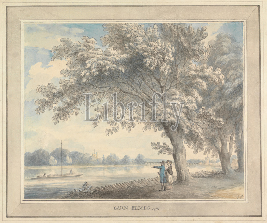 Barn Elmes, Edward Edwards, 1738–1806, British, 1793, Watercolor, gray wash, pen, gray ink, and graphite on medium, slightly textured, cream wove paper mounted on thick, moderately textured, cream laid paper (contemporary mount), Sheet: 9 3/8 × 11 3/4 inches (23.8 × 29.8 cm) and Mount: 12 7/8 × 15 1/4 inches (32.7 × 38.7 cm), boat, fence, landscape, river, riverbanks, trees, Barnes, England, Europe, Greater London, United Kingdom