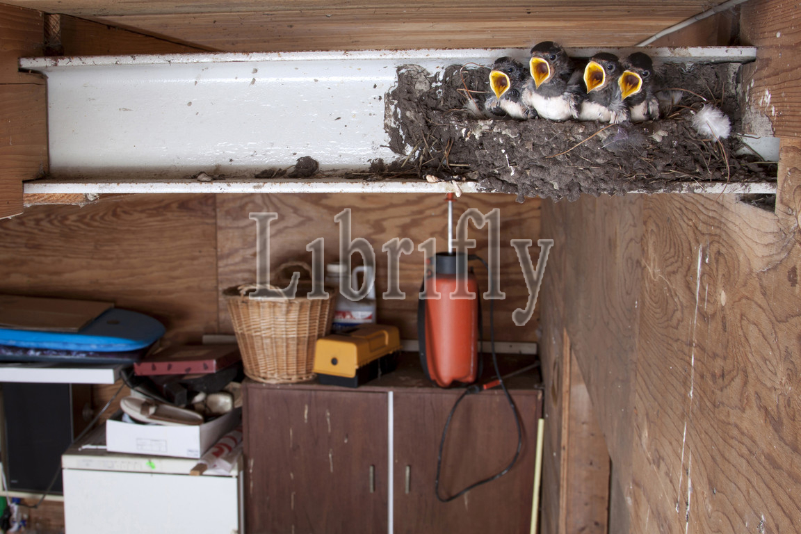 Barn Swallow chicks calling in nest in barn, Hirundo rustica
