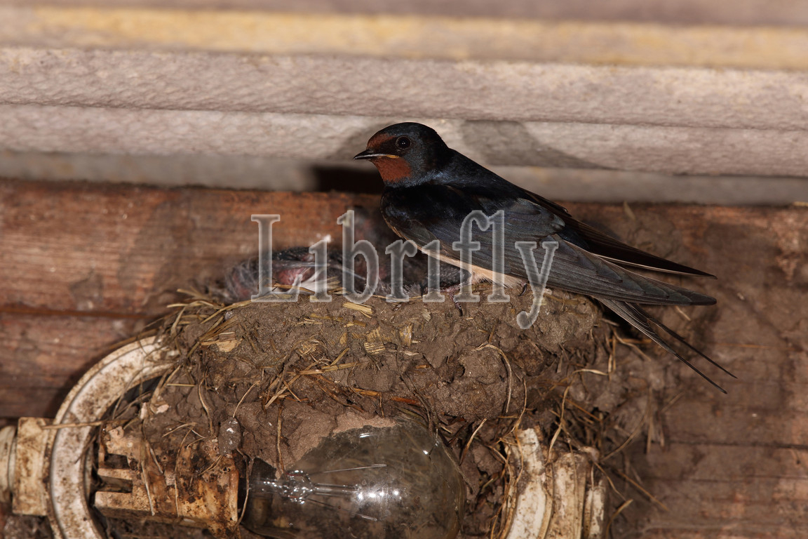 Barn Swallow with young in barn, Hirundo rustica
