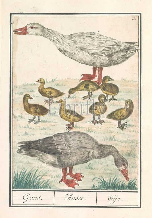 Barnacle Goose or A House Goose (Anser anser domesticus), Goose. / Anser. / Oije. (title on object), Boer goose or a house goose, with chicks. Numbered top right: 3. Part of the third album with drawings of birds. Fifth of twelve albums with drawings of animals, birds and plants known around 1600, commissioned by Emperor Rudolf II. With explanation in Dutch, Latin and French, water-birds: goose, Anselmus Boetius de Boodt, 1596 - 1610, paper, watercolor (paint), deck paint, pencil, chalk, brush, h 250 mm × w 180 mm