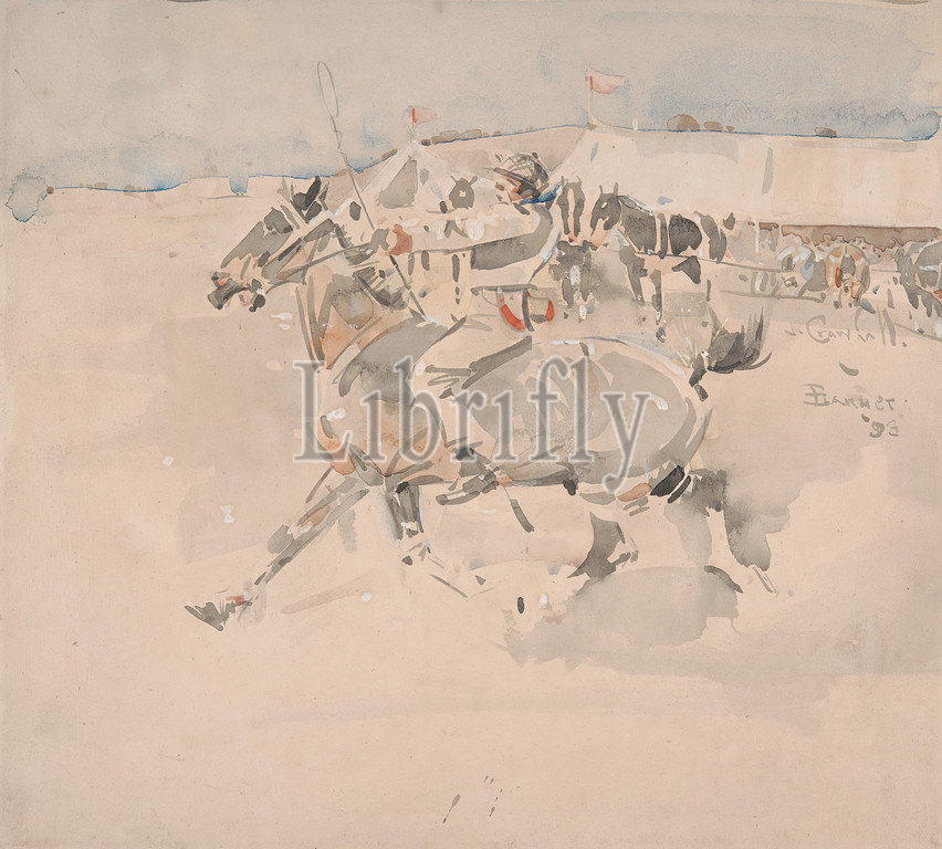 Barnett Fair, putting him through his paces, Joseph Crawhall, 1861–1913, British, 1896, Watercolor on moderately thick, slightly textured, cream wove paper, Sheet: 9 7/8 × 10 7/8 inches (25.1 × 27.6 cm), fair, horse (animal), jockey, sporting art