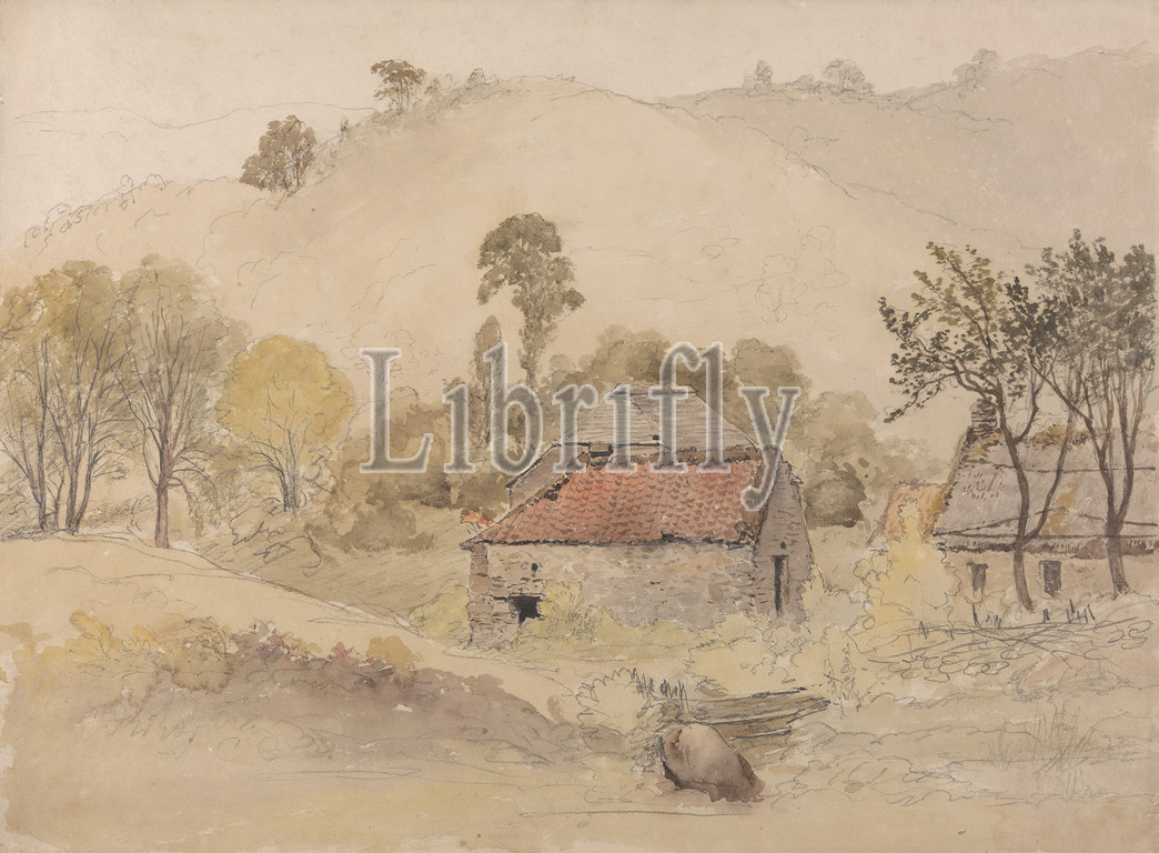 Barns, Samuel Palmer, 1805–1881, British, active, Italy, 1837–39, Watercolor, graphite, moderately thick, moderately textured, gray, wove paper, Sheet, barns, farm, landscape, mountains, trees