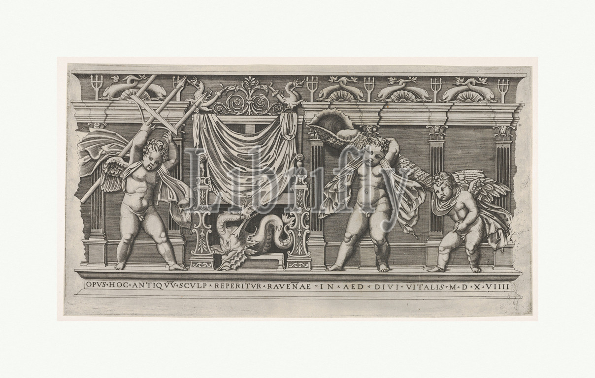 Le Bas Relief aux Trois Amours, Throne, Neptune, 1519, Engraving, sheet, 7 11/16 x 14 3/16, 19.5 36.1 cm, Prints, After Marco Dente, Italian, Ravenna, active by, 1515–died, 1527, Rome