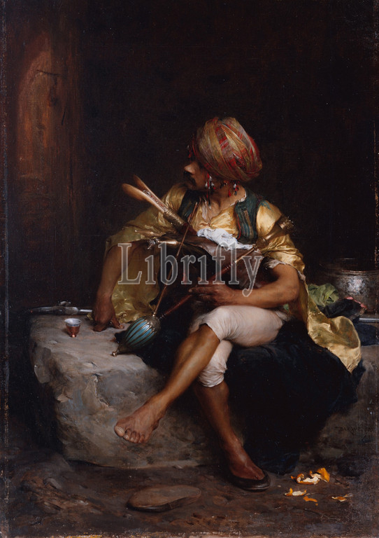 Bashi-Bazouk, 1875, Oil, canvas, 18 1/4 x 13 1/8, 46.4 33.3 cm, Paintings, Charles Bargue, French, Paris, 1825/26–1883, Bargue, paintings, better, prints, drawing manuals, treats, theme popularized, colleague Gérôme, bashi-bazouk, mercenary, holds, narghile, water pipe