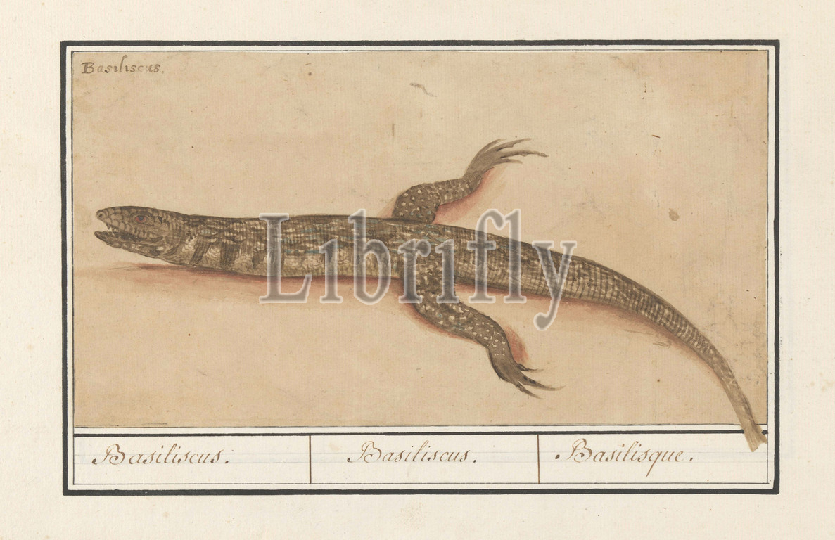 Basilisk, Basiliscus, Representation, lizard, front legs, Top left, name, Latin, Part, seventh album, drawings, reptiles, amphibians, natural history ensembles, seventh, twelve albums, watercolors, animals, birds, plants, 1600, commissioned, Emperor Rudolf II, explanations, Dutch, French, lizards, Anselmus Boetius de Boodt, Praag, 1596, 1610, paper, pencil, chalk, watercolor, paint, ink, brush