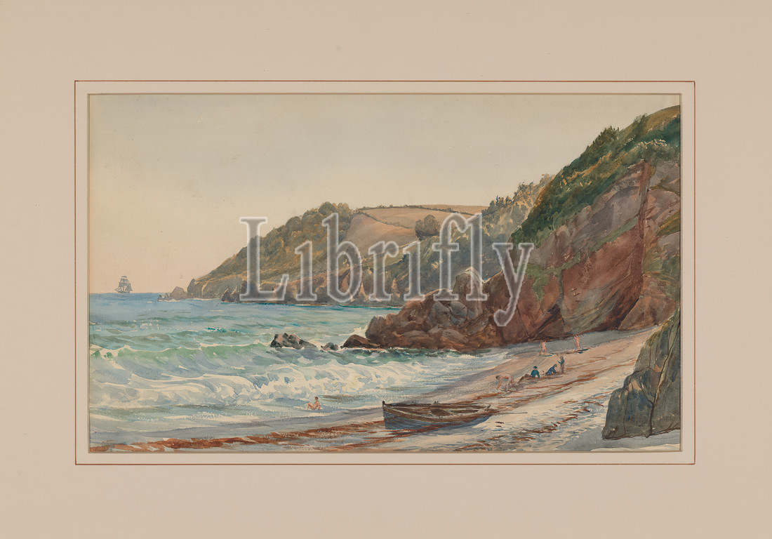 Bathing Place, Anstey's Cove, Charles Reginald Aston, 1832–1908, British, undated, Watercolor and graphite on medium, slightly textured, cream wove paper, Frame: 18 1/2 × 26 × 1 inches (47 × 66 × 2.5 cm) and Sheet: 10 3/4 × 17 3/4 inches (27.3 × 45.1 cm), bathers, beach, boat, hills, landscape, sea, waves
