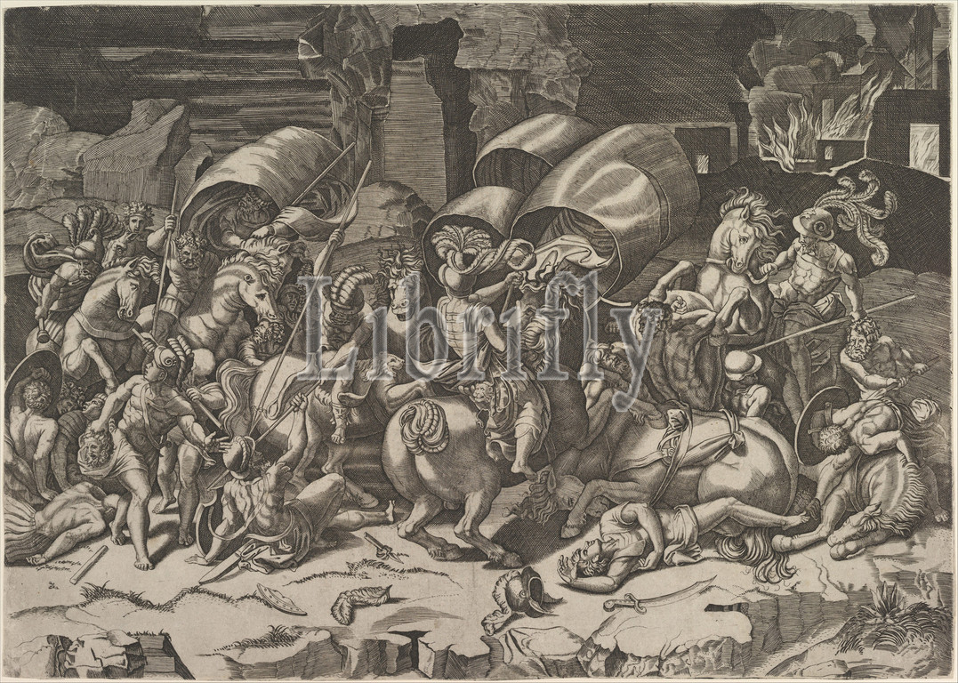 Battle, Cutlass, ca, 1515–27, Engraving, sheet, 12 11/16 x 18 1/16, 32.2 45.8 cm, Prints, Marco Dente, Italian, Ravenna, active by, 1515–died, 1527, Rome, After Giulio Romano, 1499?–1546, Mantua