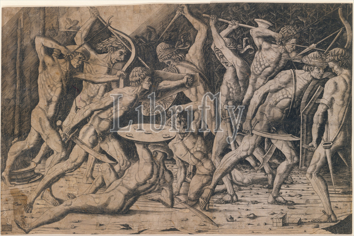 Battle of Hercules and the Giants, 15th century, Engraving; first state, sheet: 14 5/16 x 21 3/4 in. (36.4 x 55.2 cm), Prints, Anonymous, Italian, 15th century, After Antonio Pollaiuolo (Italian, Florence ca. 1432–1498 Rome)