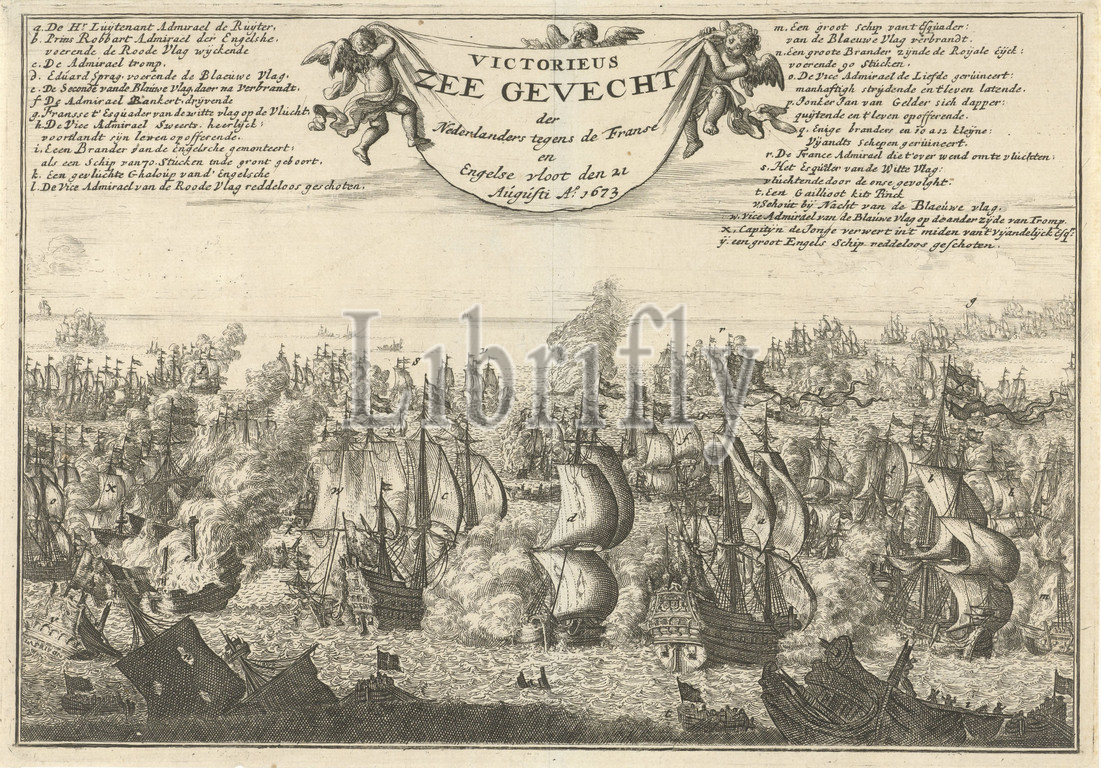 Battle of Kijkduin, 1673 Victory Sea Battle of the Dutch against the French and English fleets on 21 August 1673 (title on object), 21 August 1673. Battle of the sea between the State fleet under De Ruyter and Tromp and the combined Anglo-French fleet under Prince Rupert. Three putti are holding a vellum in the air. Left and right of this explanation of the letters placed in the battle, battle (naval force), Battle of the Texel, Jan Luyken, Amsterdam, 1688, paper, engraving, h 200 mm × w 287 mm