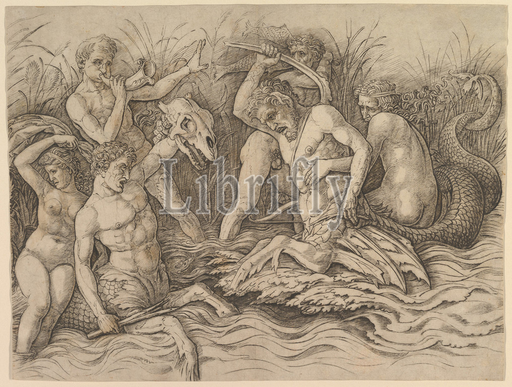 Battle of the Sea Gods (Right portion of a frieze), ca. 1485–88, Engraving, sheet: 11 1/4 x 14 3/4 in. (28.6 x 37.5 cm), Prints, Andrea Mantegna (Italian, Isola di Carturo 1430/31–1506 Mantua)