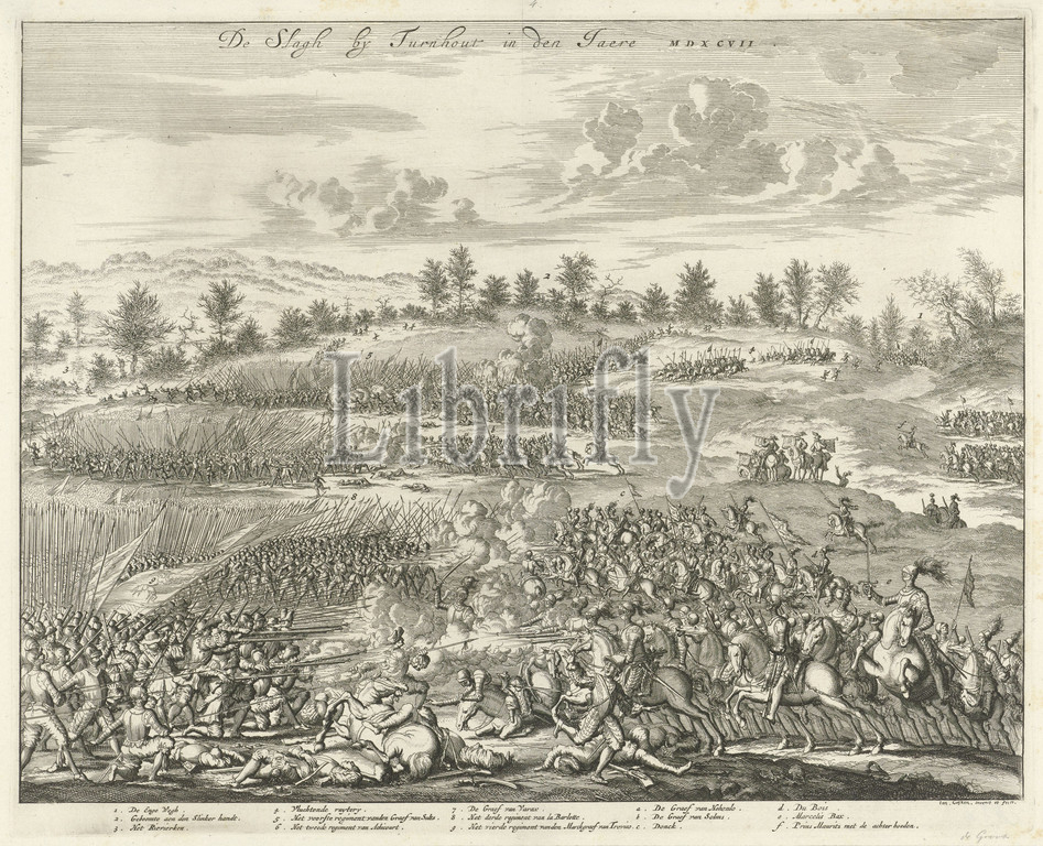 Battle, Turnhout, 1597, Slagh, Jaere MDXCVII, title, object, 24 January 1597, foreground, battle, State cavalry, Spanish infantry, background, fleeing Spanish horsemen, right Prince Maurice, caption, legend 1-9, a-f, Maurits, Prince, Orange, Jan Luyken, mentioned, Amsterdam, 1681, 1684, paper, engraving