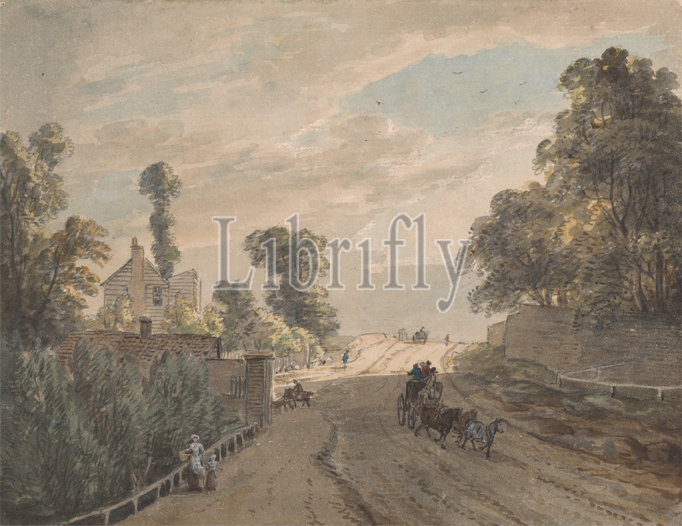 Bayswater Turnpike, Paul Sandby RA, 1731–1809, British, Watercolor, pen, black, gray ink, medium, slightly textured, wove paper mounted, card, Mount, Sheet, coaches, fence, landscape, road, sky, trees, turnpike, Bayswater, England, Europe, London, United Kingdom