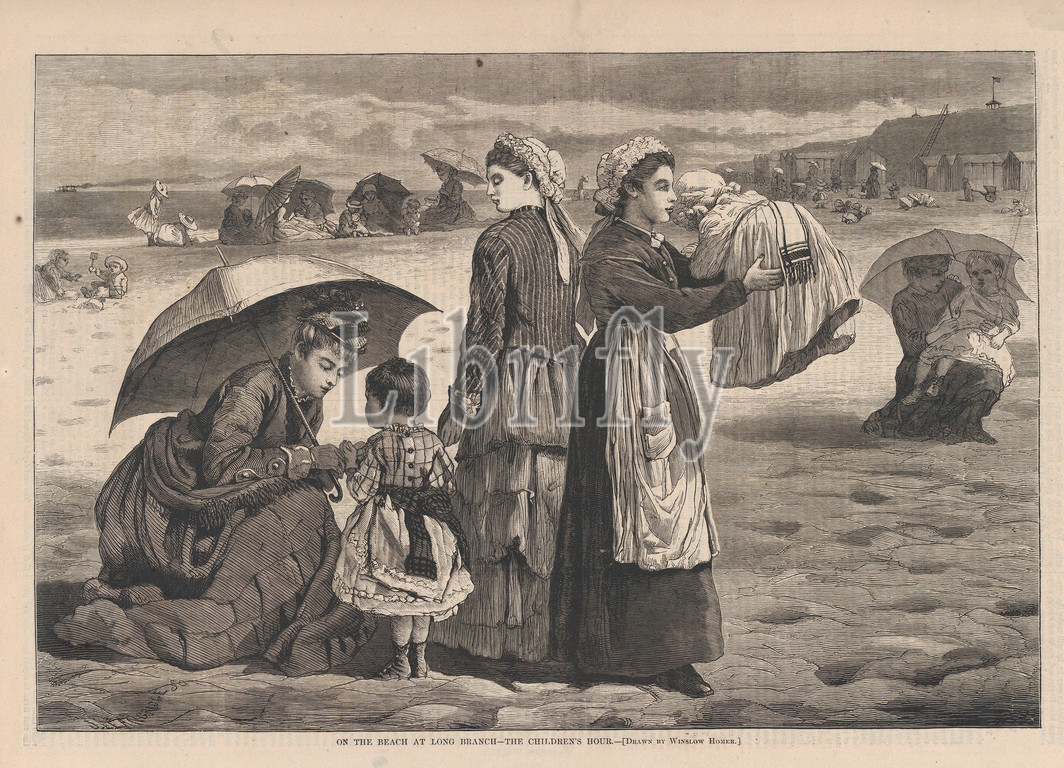 On the Beach at Long Branch – The Children's Hour – Drawn by Winslow Homer (Harper's Weekly, Vol. XVIII), August 15, 1874, Wood engraving, image: 9 1/4 x 13 5/8 in. (23.5 x 34.6 cm), Prints