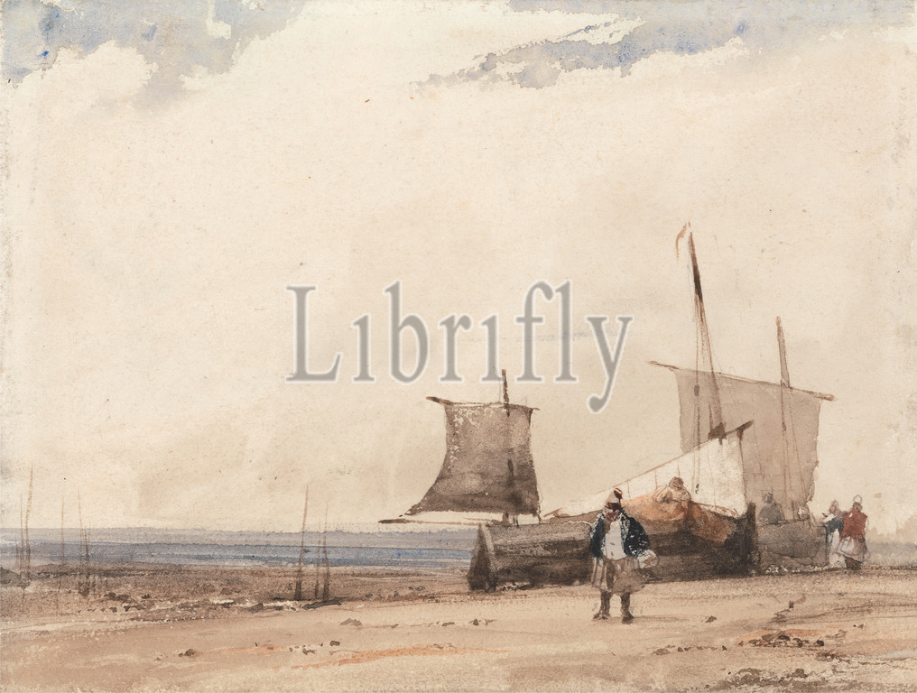 Beach Scene, Richard Parkes Bonington, 1802–1828, British, ca, 1825, Watercolor, scraping out, medium, cream, smooth wove paper, Sheet, beach, boat, coast, figures, marine art, ship